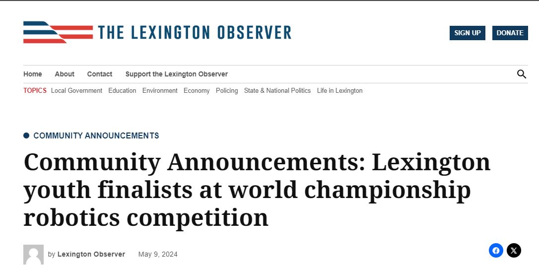 The local newspaper, “The Lexington Observer,” recognized 4024v VOID for earning the title of Division Finalist at the 2024 VEX World Robotics Championship, the highest placement by a team from Lexington at the World Championship.